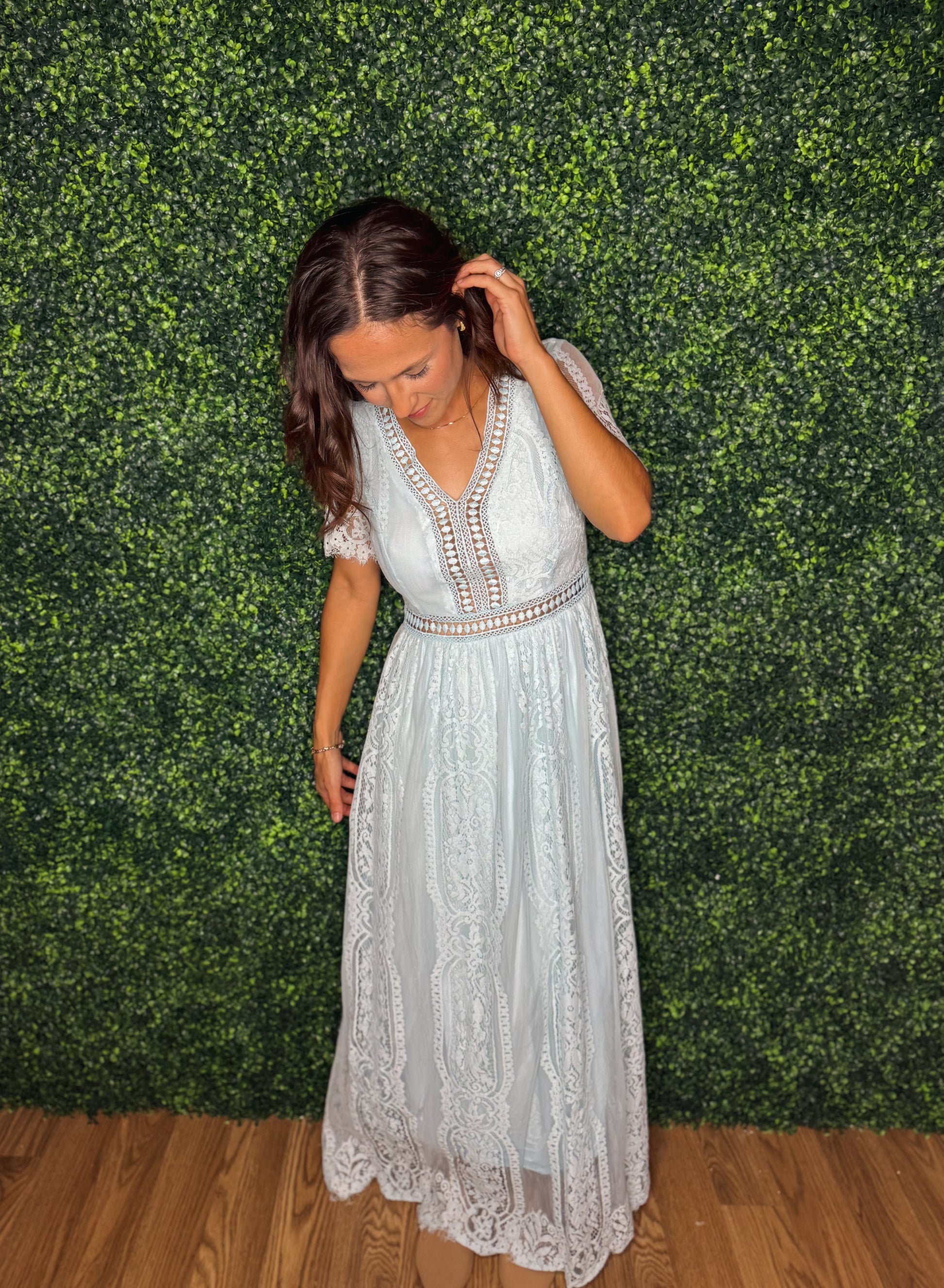 Step into timeless elegance with our Serenity Lace Maxi Dress in a soft misty blue hue. Featuring intricate lace detailing, a flattering V-neckline, and delicate short sleeves, this dress is the perfect blend of romance and sophistication. The fitted bodice with crochet trim gives way to a flowy, full-length skirt that moves with grace. Whether for weddings, family photos, bridal showers, or special occasions, this dress makes every moment unforgettable.