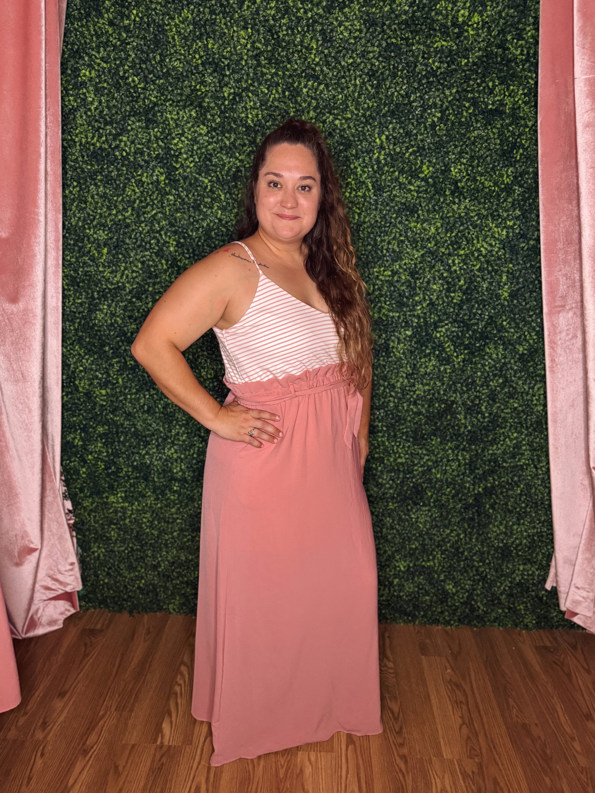 Effortless charm meets everyday comfort in our Blush Stripe Maxi Dress. This piece features a soft striped bodice with adjustable spaghetti straps and a flowy blush skirt that flatters every shape. The tie waist detail adds a feminine touch while allowing you to customize your fit. Whether you’re headed to brunch or a weekend getaway, this dress makes you look put-together without even trying.